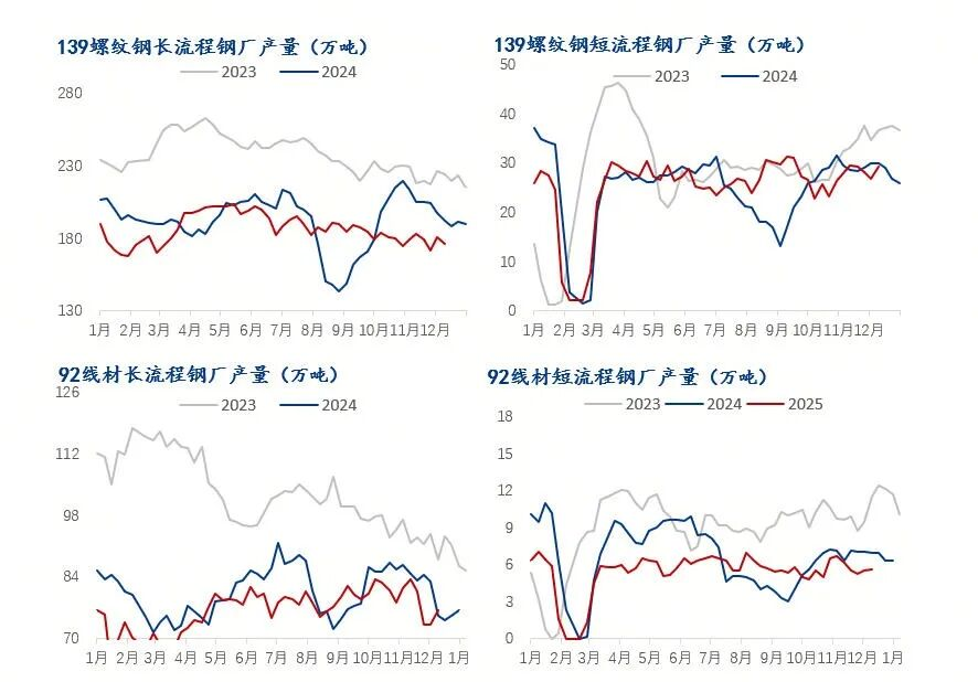截止12月25日,螺紋鋼周產(chǎn)量為184.39萬噸,月環(huán)比下降21.7萬噸,年同比下降31.92萬噸;線材周產(chǎn)量為72.33萬噸,月環(huán)比下降9.84萬噸,年同比下降10.56萬噸。分工藝來看,長流程企業(yè)螺紋鋼產(chǎn)量環(huán)比下降21.76萬噸,線材產(chǎn)量環(huán)比下降9.74萬噸;短流程企業(yè)螺紋鋼產(chǎn)量環(huán)比增加0.07萬噸,線材產(chǎn)量月環(huán)比下降0.11萬噸。