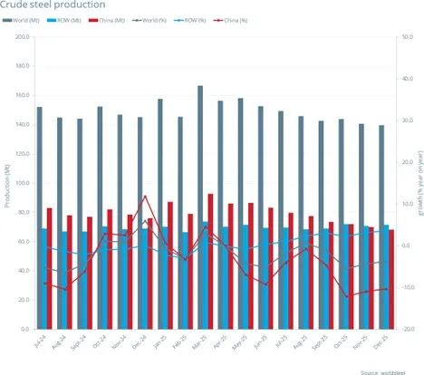 2025年12月全球70個(gè)納入世界鋼鐵協(xié)會(huì)統(tǒng)計(jì)國家/地區(qū)的粗鋼產(chǎn)量為1.396億噸,同比下降3.7%。